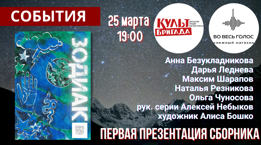 25 марта в Москве состоится презентация книги «Зодиак» редакторской серии Алексея Небыкова «Время прозы». Авторы сборника обсудят произведения и поделятся моментами о создании книги. Вход свободный.