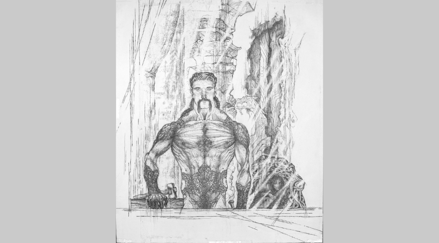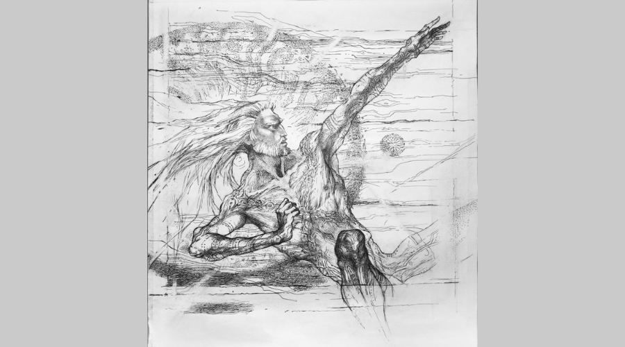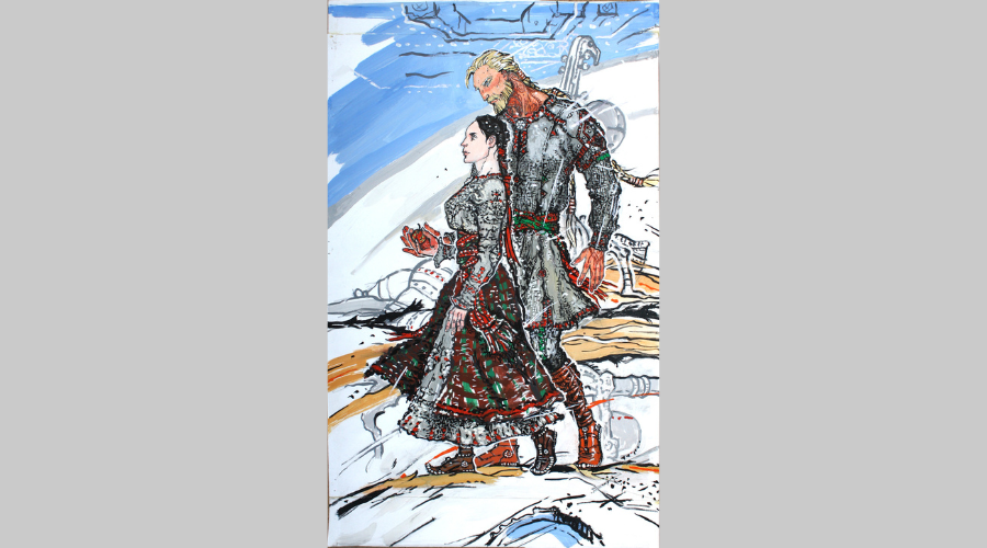 А солнечный человек — не только божество. Солнце разливает свои лучи над всем племенем, над всем народом. Что такое народ в эпосе «Полдень древних»? Народ в произведении искусства часто виден через призму жизни одного человека или нескольких представителей рода. Попавшая в доисторические времена художница Лина пребывает рядом с арьей Саром, и Сар открывает ей собственное мiроустройство через себя. Через свое тело, душу, слово, молчание.