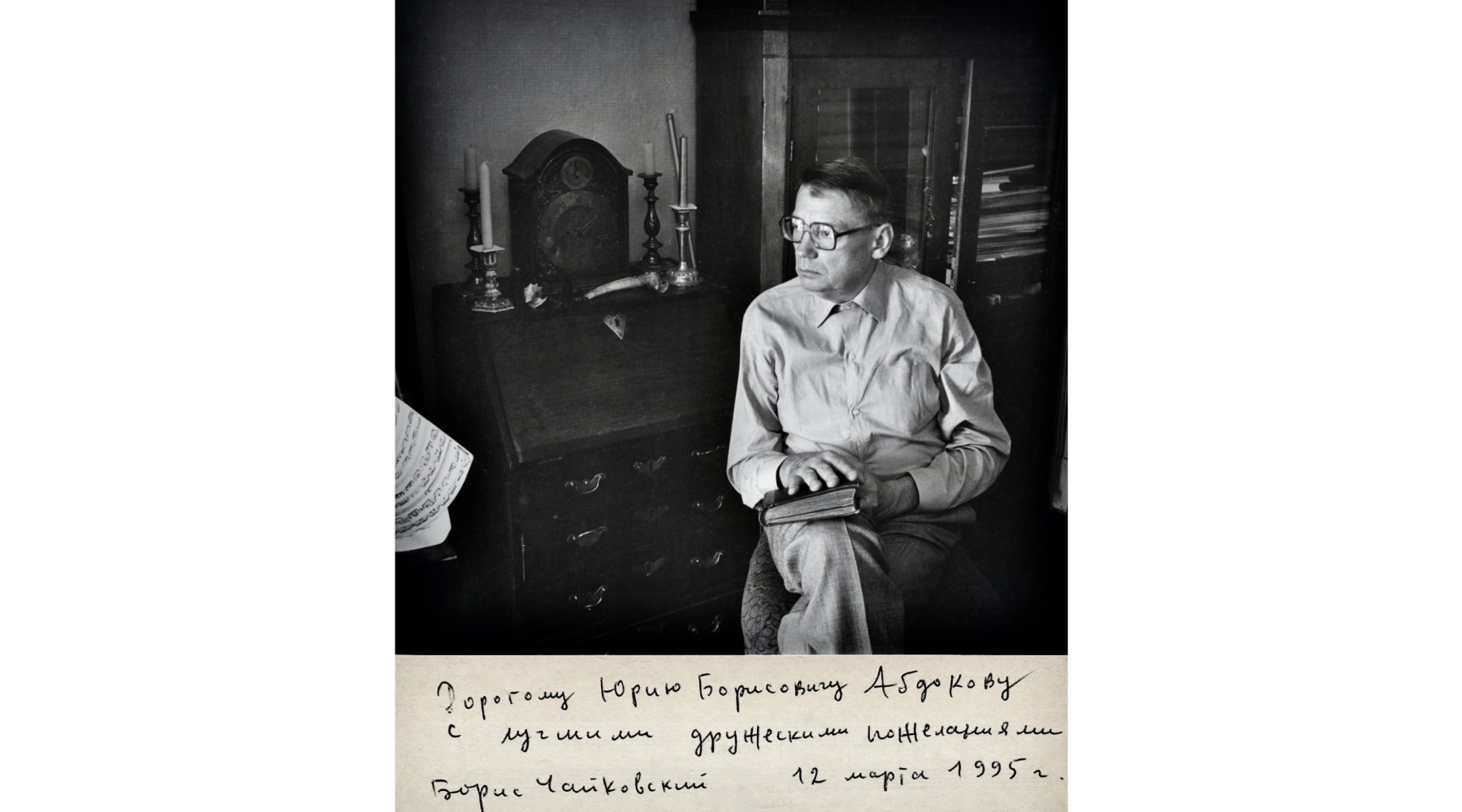 Да, в присутствии Ростроповича Хачатурян его прочитал. Оно короткое. В минуту жизни трудную несколько слов из него согревают меня, и именно этот эпистолярный документ я считаю своим главным, самым драгоценным дипломом. Самого же Карэна Суреновича сразило то, что это было именно письмо, а не устное обращение, ведь они жили не только в одном доме, но и в одном подъезде на разных этажах, можно было бы сказать при случайной встрече или позвонить. Помню дословно его слова: «В этом весь Борис. Человек-кремень. Письменное слово — это ведь как скрижали, для него это было важно…» К слову, с Карэном Суреновичем — восхитительным, лучезарным человеком и музыкантом — мы крепко дружили до последних дней его жизни, несмотря на полувековую разницу в возрасте. Именно он помог мне преодолеть страшное, едва выносимое одиночество после смерти Н.И. Пейко и Б.А. Чайковского. Я в безмерном долгу перед Борисом Александровичем, перед его верой. Застенчивость помешала мне открыто выразить ему мою любовь. Он не терпел ничего панегирического, подобострастного. Эти шести-семичасовые уроки-откровения, как и наши прогулки по Москве, я буду помнить, сколько буду жив. Я приходил к нему домой не реже двух раз в неделю, иногда и чаще. Однажды Борис Александрович предложил мне съездить с ним в подмосковное Томилино. Когда я за четверть часа до назначенного времени прибыл к Казанскому вокзалу, то увидел его у платформы курящим… Непунктуальность он, как и его учителя, считал какой-то разновидностью нечистоплотности и за всю свою жизнь, думаю, никуда не опоздал ни на минуту. Гуляя по дачному поселку, с которым у Бориса Александровича были связаны воспоминания детства, мы почти не разговаривали. Правда, еще в электричке он сказал, что задолго до революции, в XIX веке, это дачное место принадлежало предкам супруги Н.И. Пейко — князьям Оболенским. Был теплый осенний день. Борис Александрович иногда останавливался и загадочно улыбался. Я стеснялся задавать вопросы, просто упивался этим безмолвием и был по-настоящему счастлив… Только сейчас я понимаю глубинный смысл такого сердечного внимания. Он неспроста тратил свое время. Это был сложный для меня период: погибла младшая сестра и страшно пострадала в аварии мама… А книга — может и запоздалое объяснение в любви, без всяких сантиментов. Был гениальный и грустный мультфильм с музыкой Бориса Чайковского «Северная сказка». Куда-то в вечность звучат там последние слова: «Поздно, поздно…»