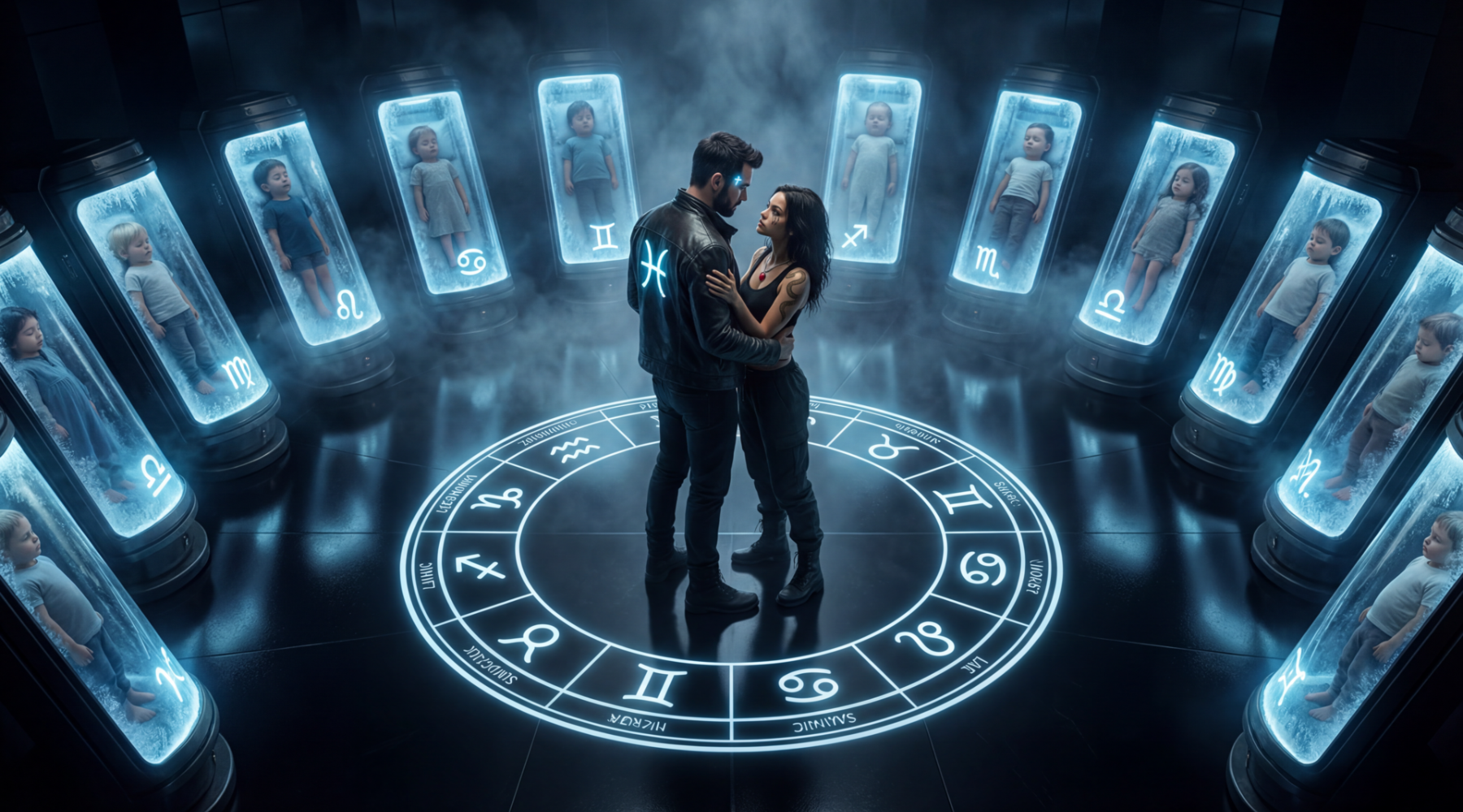 В качестве примера можно привести сцену из рассказа Аси Хоутен «Закон Зодиака» — у Армины, главного персонажа, были необычные татуировки — три змеиных хвоста под веком и змеиные хвосты на предплечьях, что символизировало ее принадлежность к Змееносцам. Такие детали и представляют собой самое сложное в сценах, потому что искусственный интеллект любит добавлять от себя. И чтобы закрепить уникальные особенности, нужен немалый опыт и находчивость. Помимо девушки в кадре, присутствовали и другие не менее важные и не менее сложные элементы — криокамеры, обозначенные знаками зодиаков, в которых находились дети. Плюс у девушки в руке нож, которым она угрожает спутнику.