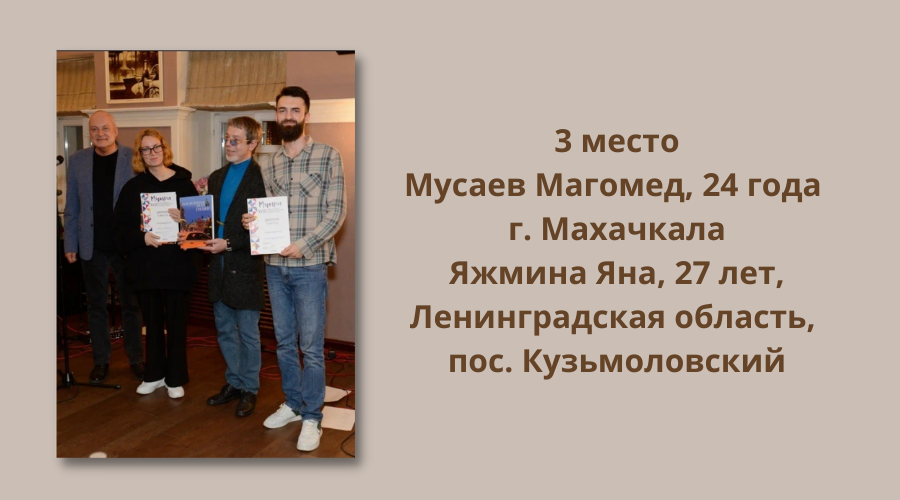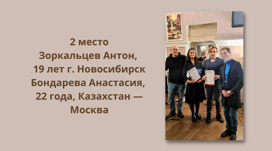 Призеры: Анохина Юлия (24 г, г. Орел), Боброва Асильда (27 л, г. Пенза), Бондарева Анастасия (22г. г. Москва), Мусаев Магомед (24 г. г. Махачкала), Назаров Андрей (25 л., г. Кемерово)