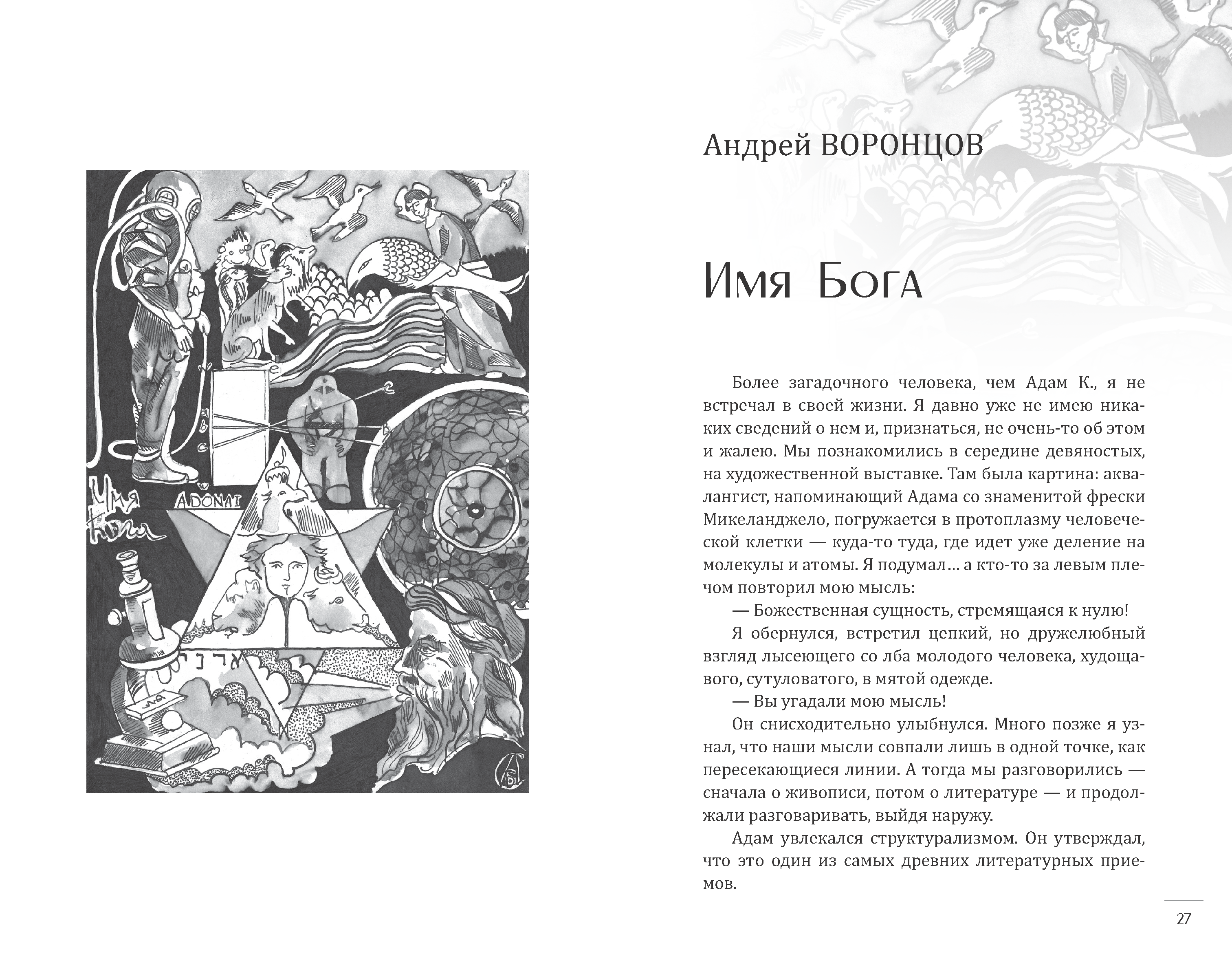 Человек изначально стремится к гармонии. Гармония есть порядок. Гармония есть Космос. А Зодиак не просто порядок; зодиакальный круг, катящийся к нам из незапамятной древности, определяет не только окрас наших психологических портретов, но и наши поступки, а значит, векторы нашей нравственности. Мы слишком близко ходим к краю нравственной пропасти; и рассказ Андрея Воронцова «Имя Бога» о встрече двух людей — Адама и Виктора (символика имён тут несложная: Адам — первый человек, Виктор — победитель...) показывает нам, как можно утонуть в толкованиях архаической ближневосточной символики, мечтая, что разгаданная загадка древнего тетраграмматона предъявит нам, смертным, имя всевластного бога; но эта соблазнительная загадка на самом деле уводит далеко в сторону от подлинности, истины Божиего имени. Символичен и в то же время реалистичен, прозрачен, светел и прост финал рассказа, погружающий читателя в атмосферу Светлого праздника Пасхи, тогда как на протяжении всего повествования два его героя спорили о смыслах Каббалы и о вариативности и значимости сакральных знаков и имён: