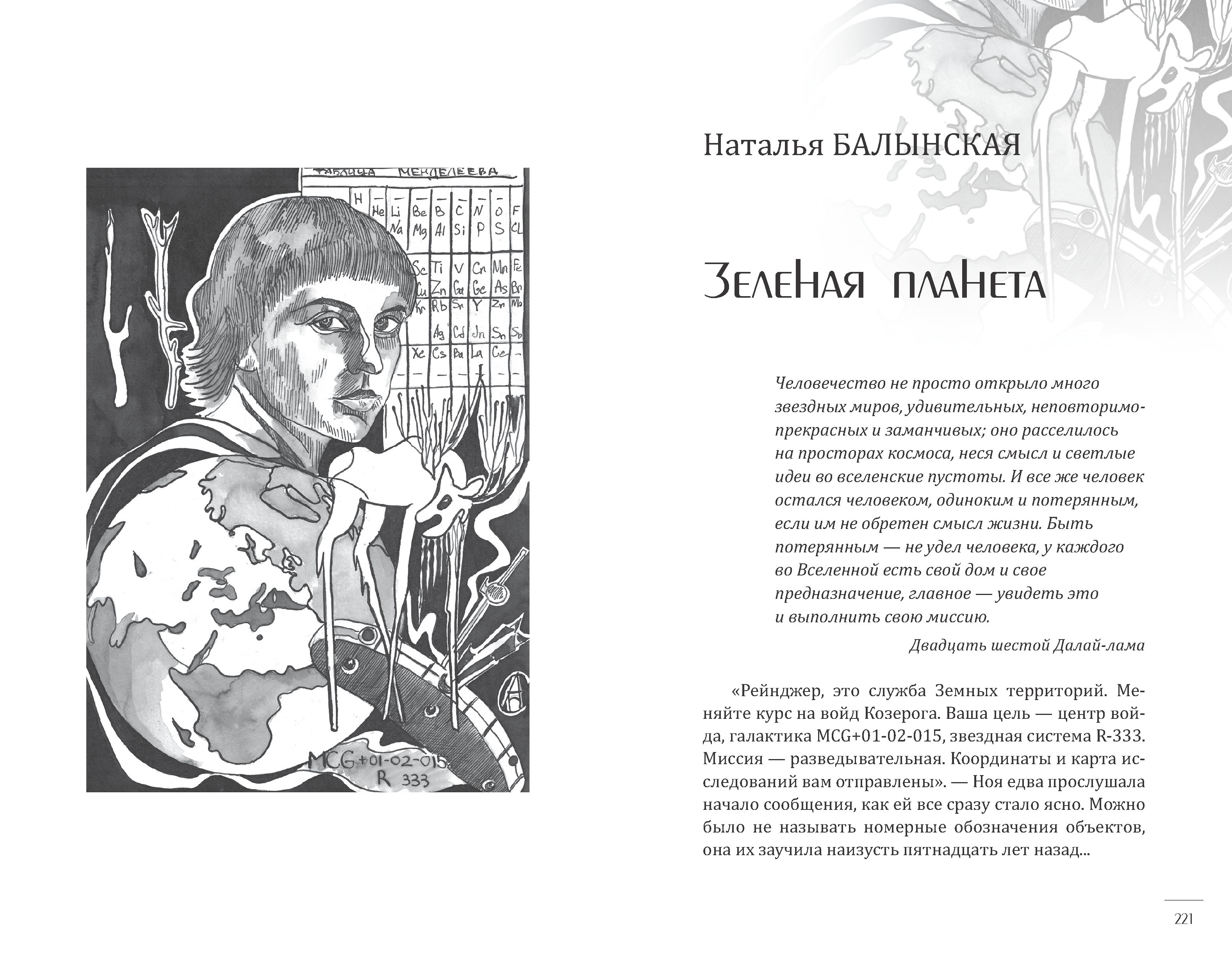 А обложка, созданная Алисой Бошко, — своеобразное зеркало, где совокупно отражается основной, фундаментальный знак книги: соединение звёздных необозримых миров и драгоценность преходящей — и всё же вечной! — земной жизни. Сочетание изумрудного, густо-зелёного, ультрамаринового колорита, вспышек белого и голубого (наиболее горячие звёзды — именно синие и белые!), гамма холодных цветов, намекающих нам на ледяное бытие Космоса, подразумевает яркие, пламенные интонации Земли (ведь синее земное небо, синие моря, зелёные ковры лесов, тайги — это тоже колористика обложки книги!), страсть и непредсказуемость сюжетов, живую кровь запечатлённых в рассказах образов. Книга в таком оформлении получилась истинным произведением искусства.