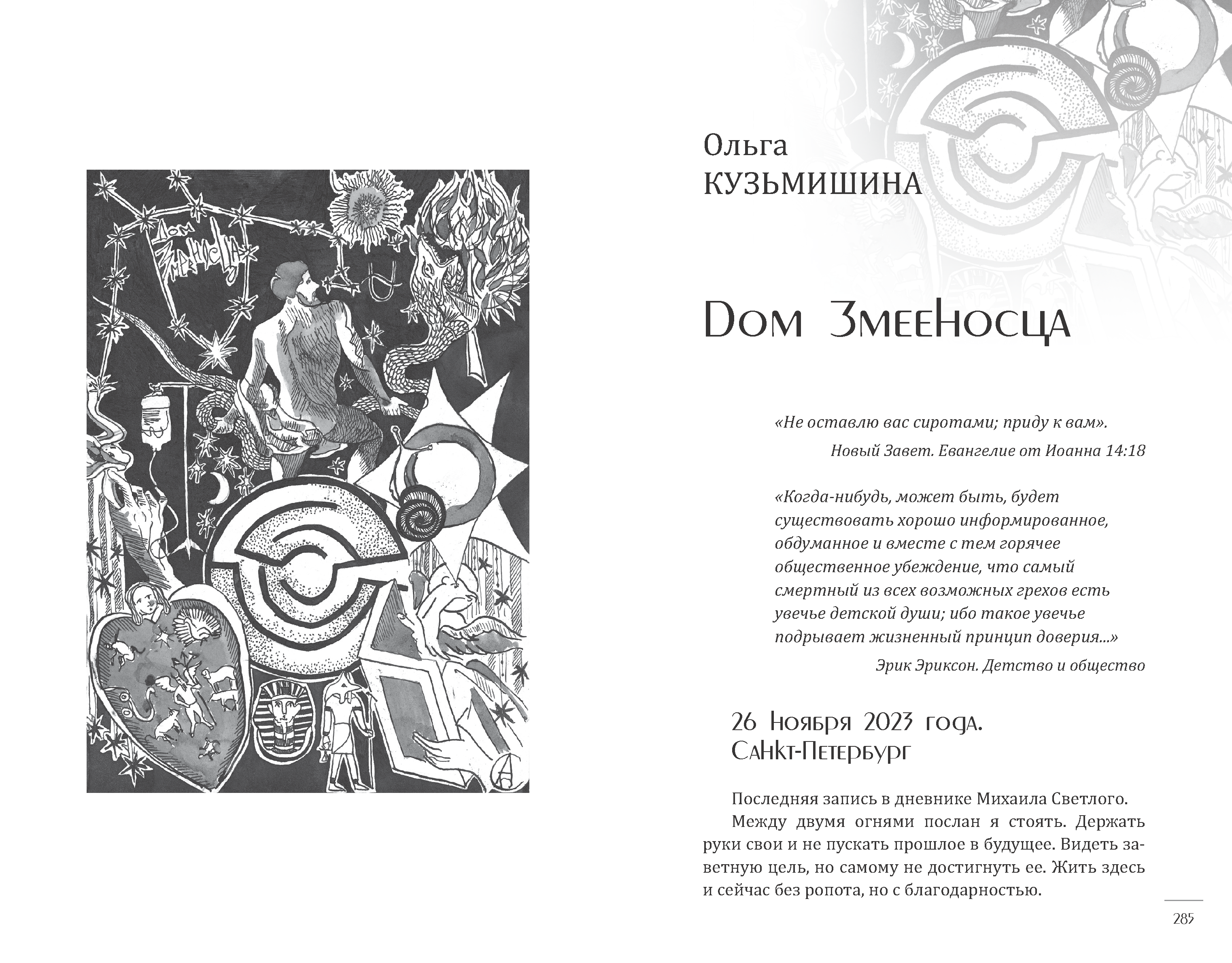 Каждый автор выбирает свою дорогу в необъятности звёзд и многонаселённости Земли. Мы все живём на Земле одну жизнь, и живём её так, что нам кажется: смерти никогда не будет. Это будет с кем-то, но только не со мной! И, однако, прощание с миром слишком рядом. Более того: оно глубоко в нас. И оно есть глубина философии, которая, как дрожащий мотылёк, летит на свет, исследуя и подразумевая тьму. Дуализм мироустройства, сражение Тьмы и Света, идущее бесконечно и неостановимо, вот фундамент символизма сборника, его трагической симфоничности, и в то же самое время мы все ждём, неистово, молча ожидаем, что из Тайны Двойного родится третий: так рождается дитя у любящей пары, так в даосизме появляется Третий Путь, так у заданности зодиакальных созвездий появляется выламывающийся вон из традиционного ряда мудрый, соединяющий звёзды и Землю Змееносец (змея = земля: «...и жало мудрыя змеи / В уста замершие мои / Вложил десницею кровавой...» — А.С. Пушкин, «Пророк»).