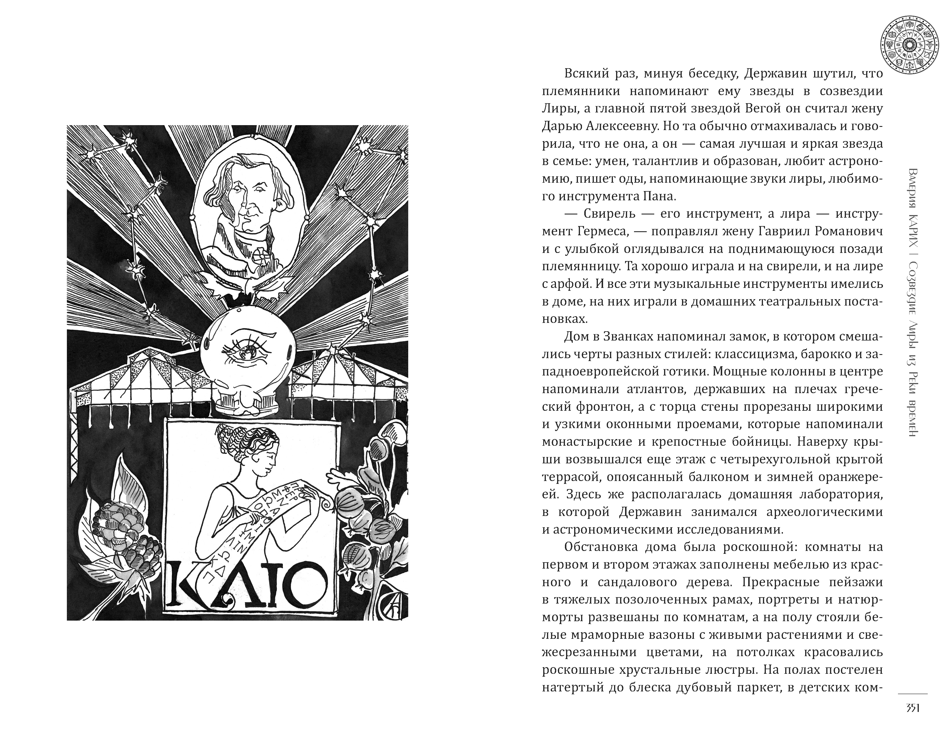 И снова он услышал, как порывисто и смело заиграла сотканная из воздуха арфа, или, быть может, его Лира... Чистые нежные звуки растекались, наполняя пространство и отражаясь от стен, усмиряя его гордое усталое сердце, навевая давно позабытые картины. Ярко вспыхнул на «Реке времен» шар с созвездиями, наполнился странным голубым свечением. Потоки времен и истории устремились и перетекали за края позолоченной рамы, наполняя пространство прозрачной чистой водой и образуя огромный светящийся шар. И он погрузился в этот сияющий шар с тихим и спокойным вздохом...» (В. Карих «Созвездие Лиры из Реки времён»).