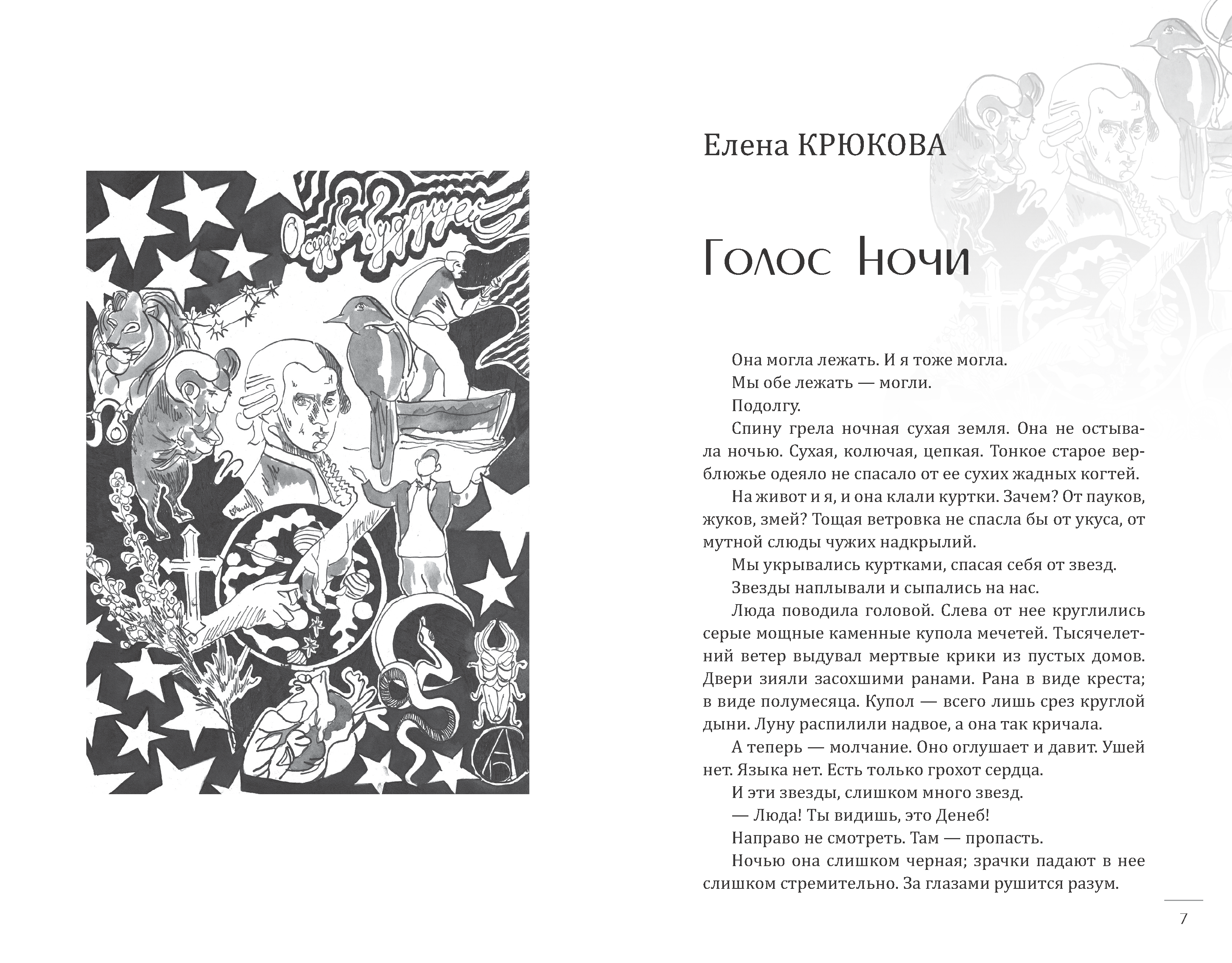 Два слова обязана я, автор книги, сказать и о своём рассказе «Голос ночи». Этот рассказ — одновременно и почти документальная проза, ибо всё изображённое имеет правдивую подоплёку, и почти музыкальная фантазия: как внутри любого искусства, где правда и выдумка крепко переплетаются, рождая на выходе то воспоминание, что огнём выжгло шрам на сердце автора, а рядом — ту импровизационность живых диалогов, что от выжженной солнцем крымской земли попадают прямиком в шевелящееся над головами звёздное, бездонное, сияющее небо. Сияние! Это вещь незаёмная. Мы сами — одновременно и звёзды, и люди. Мы звери и птицы, мы история и нежность, мы сия минута и тяжкий фундамент вечных пирамид. Мы — и музыка, и молчание. Да, по Державину, ничто «общей не уйдёт судьбы», но, наряду со смертью, с всепожирающим Временем, у нас есть ещё и другая судьба. Она — маяк. Она — звезда путеводная. Именно на свет этой звезды мы идём, сбивая ноги в кровь, веселясь и танцуя, воюя и любя. Это именно мы — Зодиак. Все мы. Охватывающие звёздным горячим поясом видимую и невидимую Вселенную. Беседующие на краю неба, над пропастью Времени, озорно и весело, будто жить нам на свете целую вечность:
